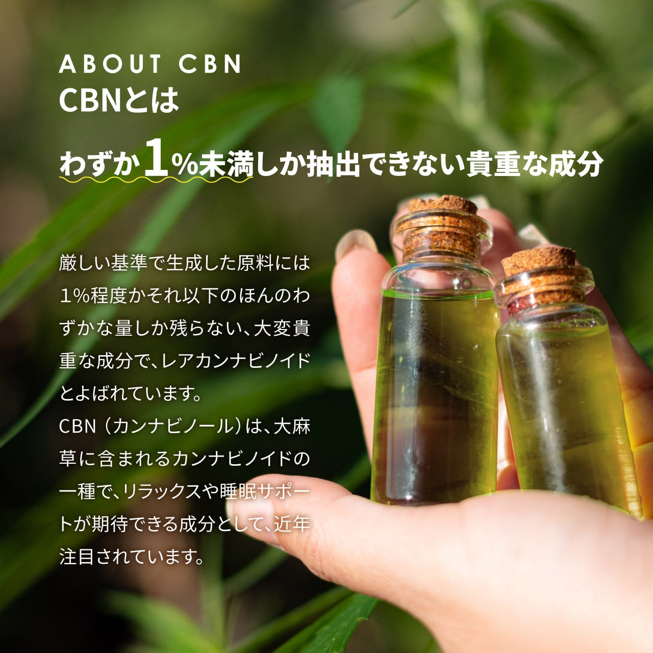 CBN (カンナビノール)は、大麻草に含まれるカンナビノイドの一種で、リラックスや睡眠サポートが期待できる成分として、近年注目されています。