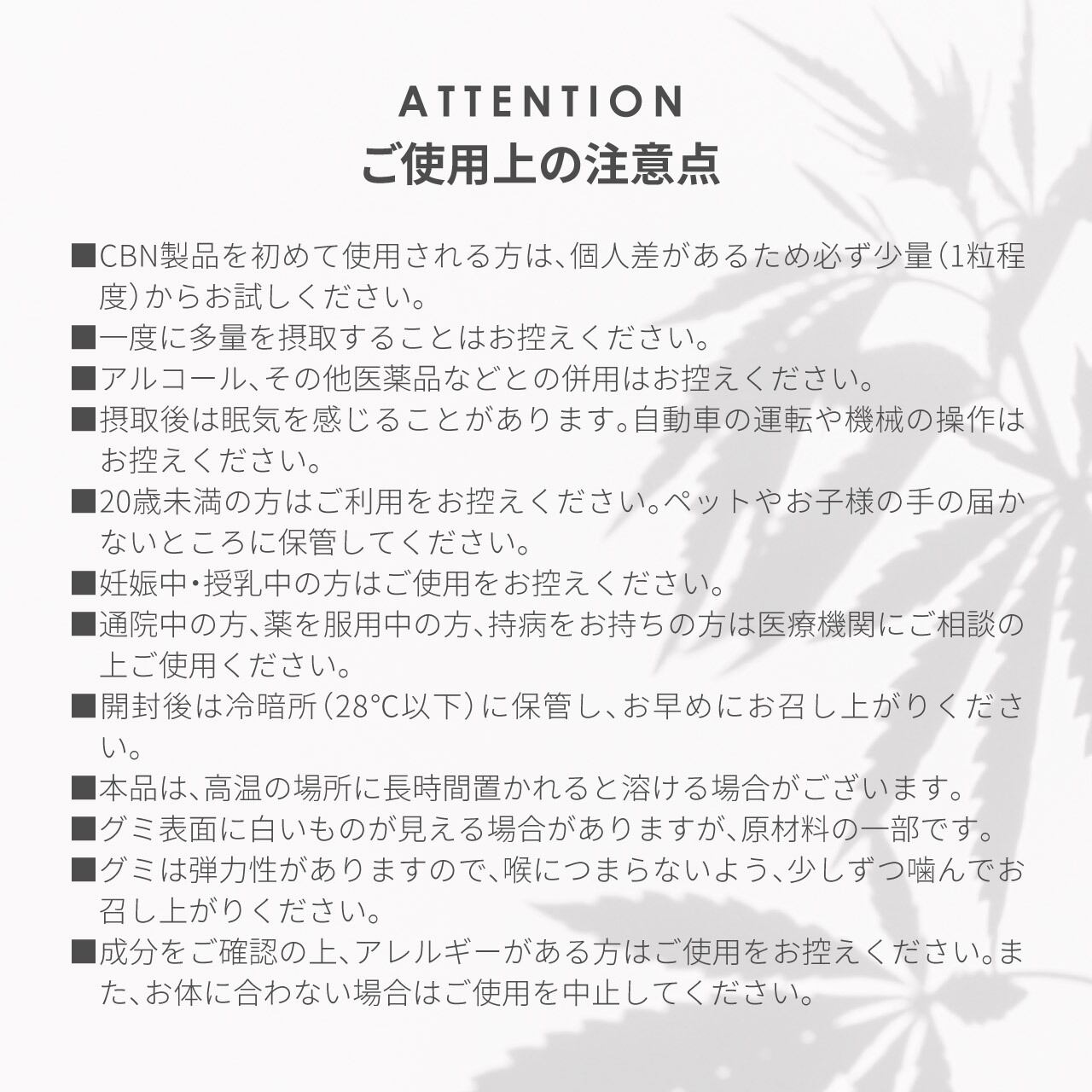 CBN製品を初めてご使用になる方は、体感に個人差があるため必ず少量(1粒)を目安にゆっくり噛んでお召し上がりください。